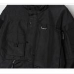 L’attention portée aux détails avec ses multiples poches, ses différentes fermetures et le design du dos ajoutent de la consistance à l’esthétique du manteau. Les sangles discrètes et les fermetures à glissière de qualité supérieure renforcent le caractère techwear de ce manteau, tout en soulignant son inspiration street et militaire.